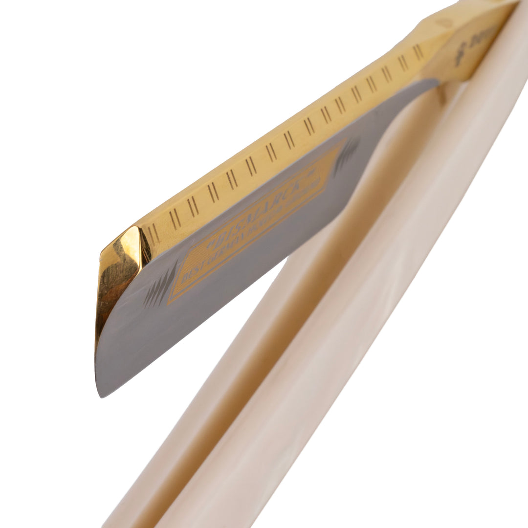 24 Karat Gold This stunning Dovo 'Bismarck' Cut Throat Razor features stunning pearl white acrylic handle and ornate blade with 24-karat gold etching. Made from the highest quality carbon steel, this razor has a 6/8" round point, full hollow ground blade and offers the ultimate in blade hardness, elasticity and resistance... Read more